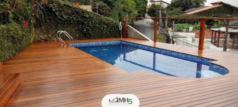 O deck de madeira para piscinas combina conforto térmico, segurança e um visual natural que eleva o design do seu espaço externo. Ele cria uma área agradável para relaxar, tomar sol e se divertir com mais charme e proteção.